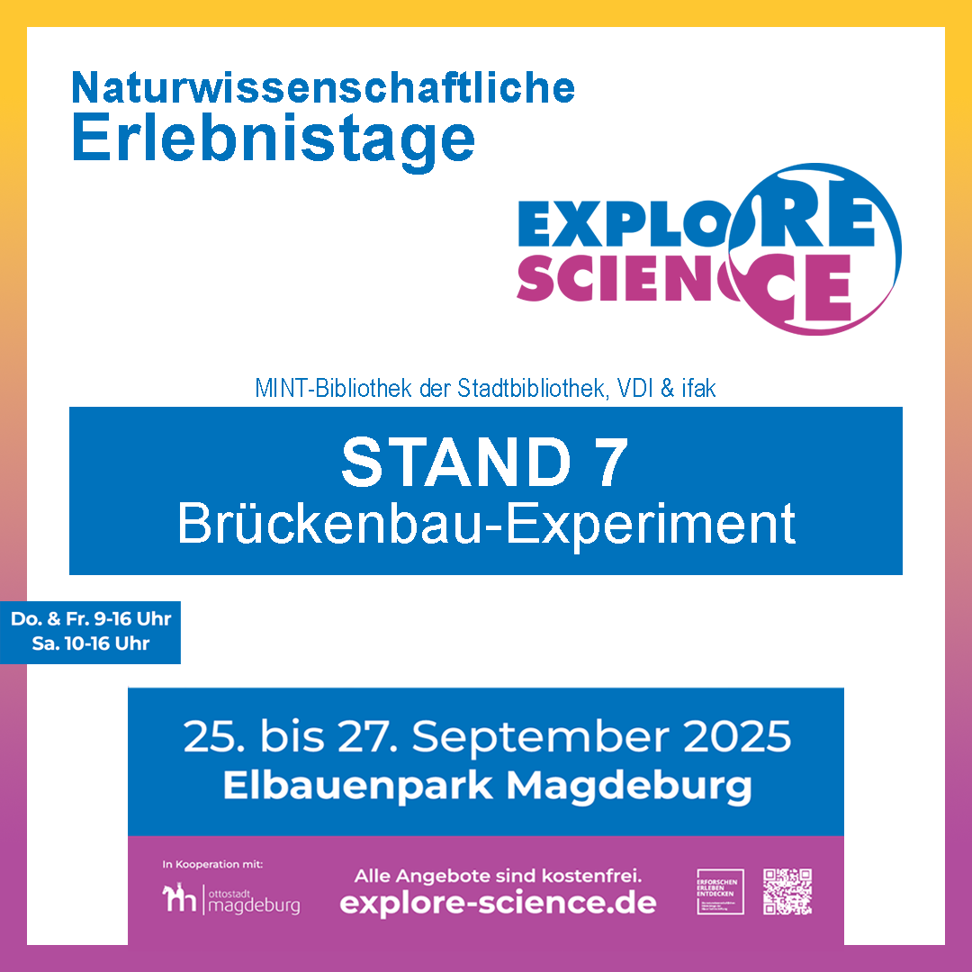Unser Experiment: Das ifak lädt zusammen mit der Stadtbibliothek Magdeburg und dem VDI Magdeburger Bezirksverein zum Mitmachen an Stand 7 ein. Zusammen mit den Kindern (Altersempfehlung Klasse 1 – 8) werden wir Brücken bauen und somit unsere besten Nachwuchs-Brückenbauer für Magdeburg ausfindig machen!