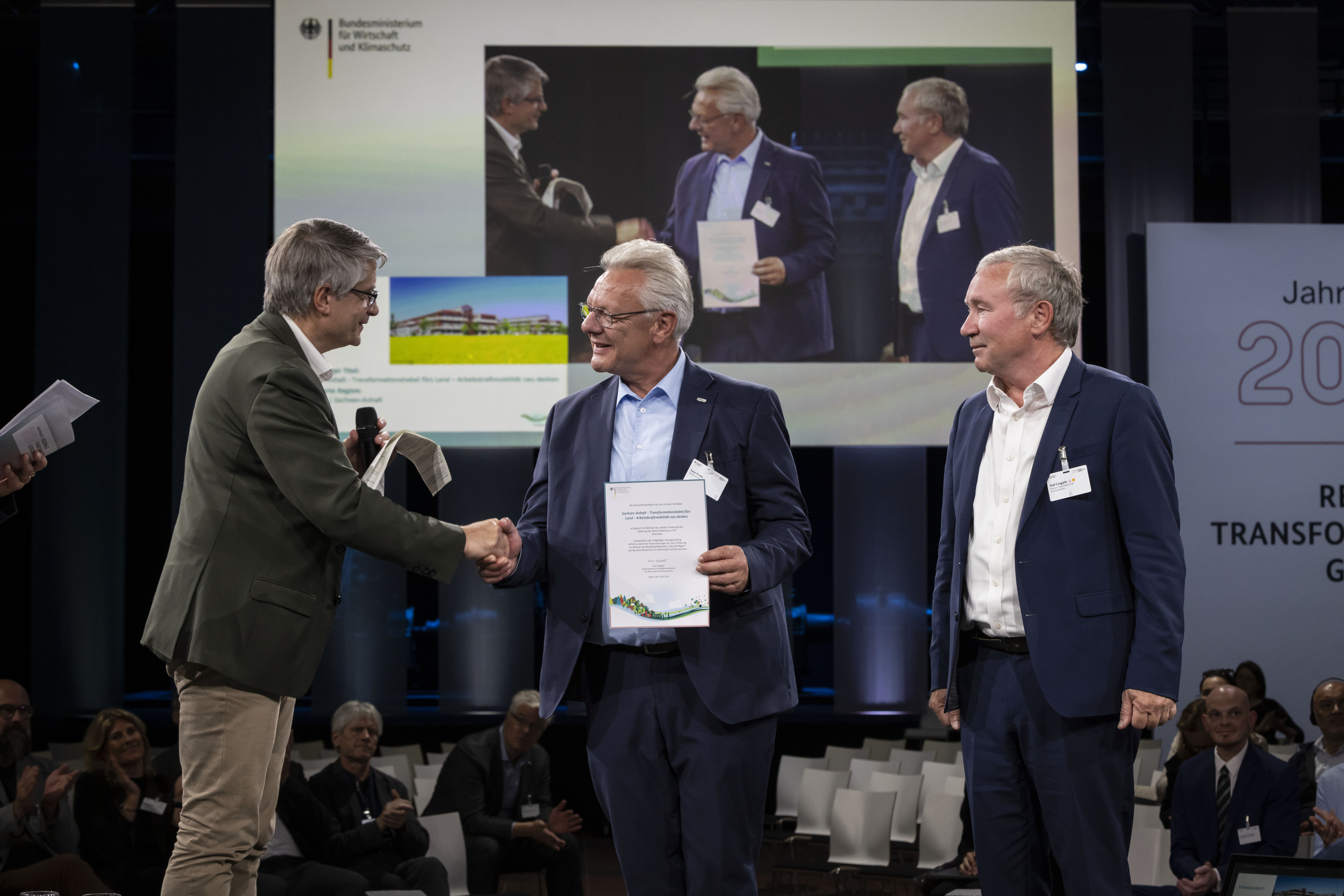Am 16. und 17. September 2024 fand in Essen die 2. Jahrestagung „Regionale Transformation Gestalten“ des Bundesministeriums für Wirtschaft und Klimaschutz (BMWK) statt. Die Veranstaltung hat mit über 580 Gästen einen nennenswerten Zuspruch von zahlreichen Interessierten insbesondere aus Wirtschaft, Wissenschaft, Politik, Verwaltung, Verbänden und Gewerkschaften erfahren. Auf dem Kongress wurden insgesamt 17 Vorhaben ausgezeichnet, die sich erfolgreich im Rahmen des zweiten Förderaufrufes „Stärkung der Wertschöpfung vor Ort“ des Bundeswettbewerbs „Zukunft Region“ beworben hatten. Darunter ist die Gemeinde Barleben mit dem Vorhaben „Sachsen-Anhalt Transformationshebel fürs Land-Arbeitskraftmobilität neu denken (STRAHLKRAFT)“ für die stellvertretend Herr Sven Fricke (Gemeinde Barleben) und Olaf Czogalla (ifak) die Urkunde zum Förderbescheid von Staatssekretär im BMWK Sven Giegold entgegennahmen.