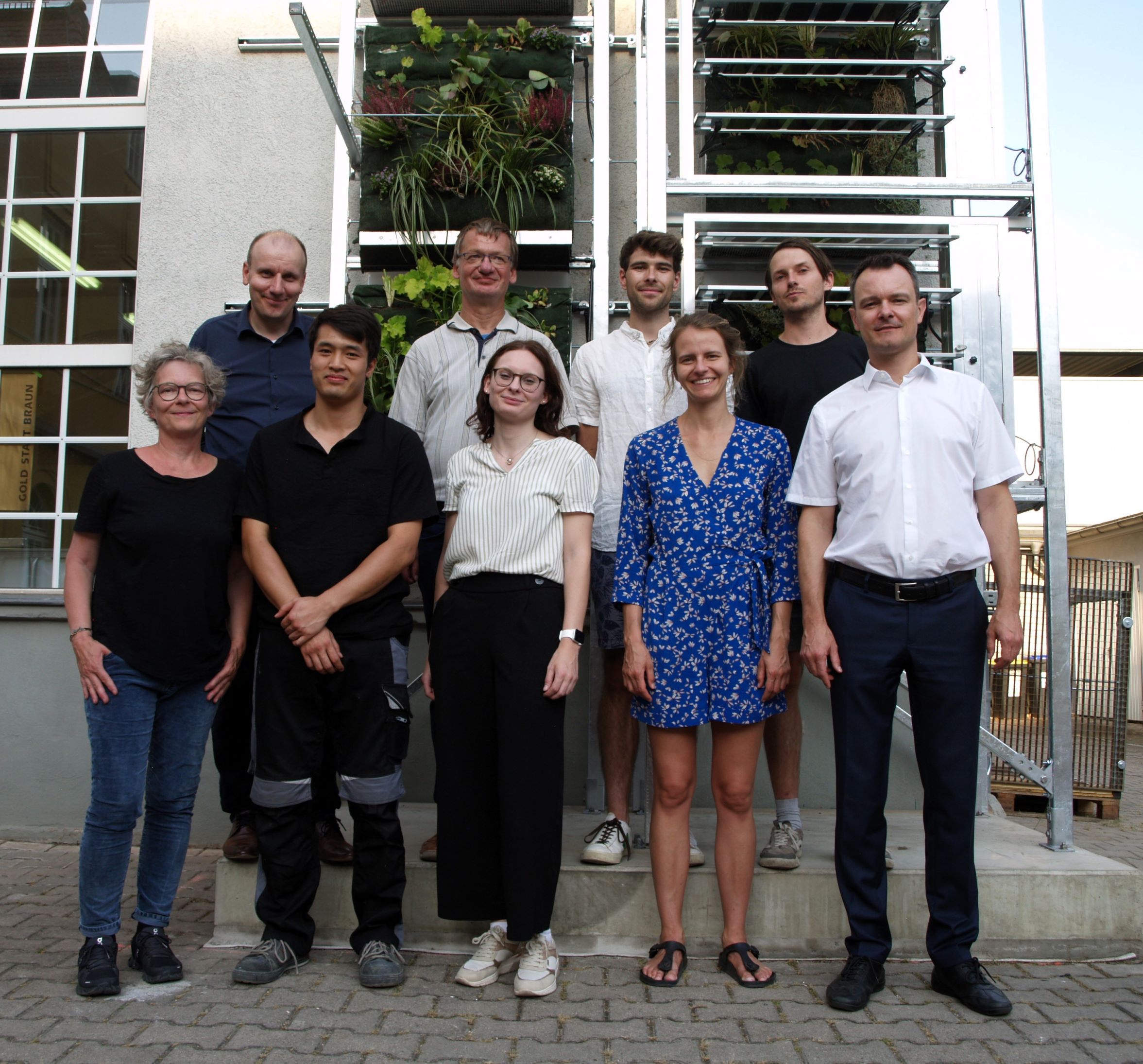 The real prototype of the VertiKKA vertical sewage treatment plant was inaugurated in Weimar on 5 September: an innovative façade greening element has now been installed on the Technikum building of Bauhaus University. In addition to plants used to treat grey water, it also consists of photovoltaic elements to generate electricity. An extensive measurement programme is planned over the next few months to quantify the efficiency and also the expected cooling effects to improve the urban climate. As one of the partners in this interdisciplinary research project funded by the BMBF as part of its ‘Resource-efficient urban districts’ funding programme, Dr Schütze from ifak took part in the inauguration ceremony as well as in working discussions with the research group.